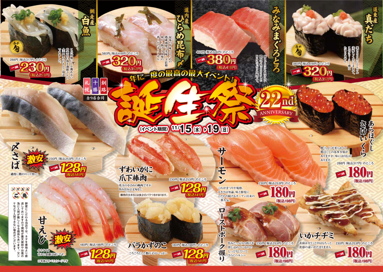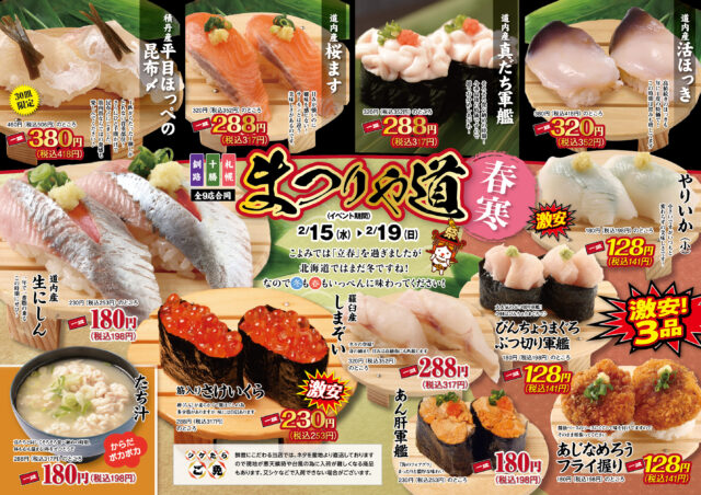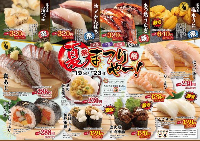 北海道の旬を味わう「回転寿しまつりや」の最新情報をお届け!さらにまつりやでは、四季折々の食材を楽しめる限定イベントを開催しています。春夏秋冬、その季節ならではの新鮮なネタや特別メニューをお寿司で堪能しながら、家族や友人と心あたたまる時間をお過ごしください。