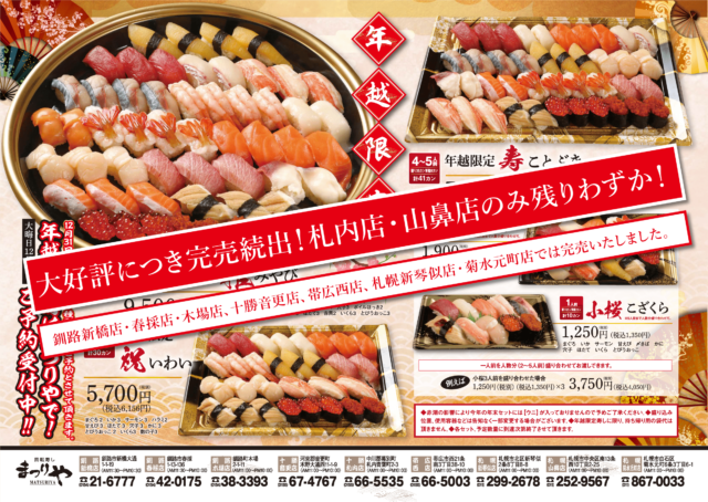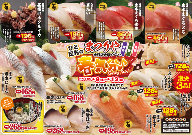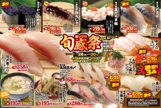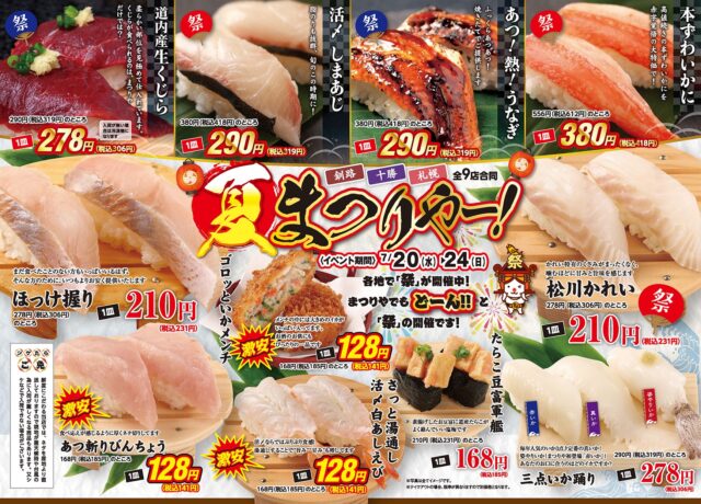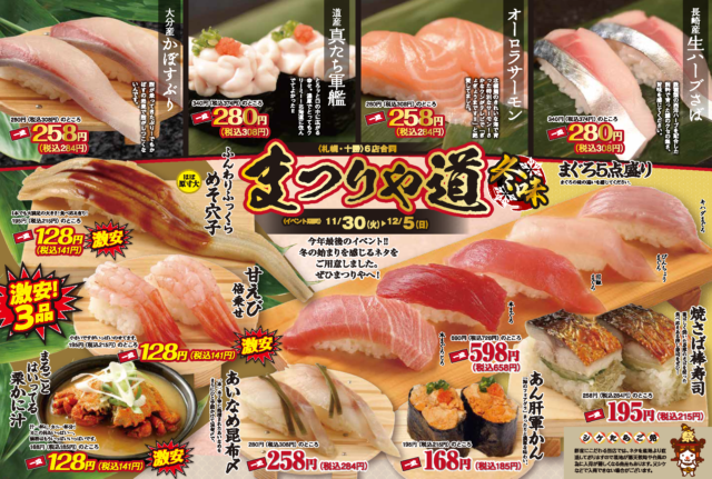 北海道の旬を味わう「回転寿しまつりや」の最新情報をお届け!さらにまつりやでは、四季折々の食材を楽しめる限定イベントを開催しています。春夏秋冬、その季節ならではの新鮮なネタや特別メニューをお寿司で堪能しながら、家族や友人と心あたたまる時間をお過ごしください。