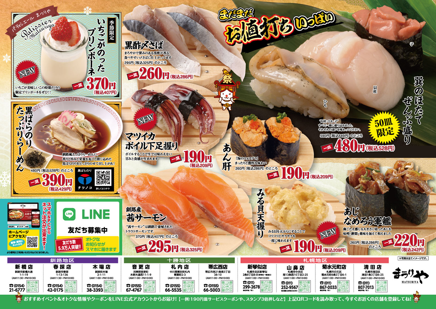 その他にも「道内産 真だち軍艦」「本まぐろ大トロ」「大分県産他 寒ぶり」「真ふぐ ゆず和え軍艦」など、魅力たっぷりな食材を使用したお寿司をご用意しております。この機会にぜひ、まつりやのお寿司をご堪能ください。